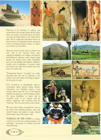 Following in the footsteps of explorers and archaeologists from Europe, Japan and the United States, our cameras crossed the deserts of Central Asia from the Pamir Massif to the Yellow River plain. The art, architecture and culture of this vast land are shown in breathtaking details and placed in their fascinating historical context, in images never before seen in the West. Along the ancient caravan trails, we filmed lost cities built in the Classical Greek style, magnificent Buddhist cave temples with heavily Indo-Hellenistic influence, tombs deeply buried beneath the shifting desert sands, beautifully preserved wall paintings and fabulous sculptures, together with an abundance of artefacts which have thrown new light on the cultural and social history of Central Asia. "Underground Palaces" of gigantic size, richly decorated make this tour as important as the earliest visits of the Valley of the Kings in Egypt - but far greater in scope. Cave monasteries of unimaginable intricacy, extraordinary tombs, glorious murals, bronzes, manuscripts, and delightful pottery, reveal amazing details about the lives of the Imperial Families, the aristocracy, and the ordinary people. The spread Buddhism, its beliefs and its wonderful works of art, together with the Chinese infatuation with everything from the "barbarian" West, are shown here as never before. We also visited villages surrounded by some of the world's most haunting sceneries, cities with colorful bazaars and people of many ethnical backgrounds living in this magic world. TEMPLES OF THE GODS is a unique record of one of the most amazing journeys ever undertaken - the journey of a lifetime, down the Great Silk Road.